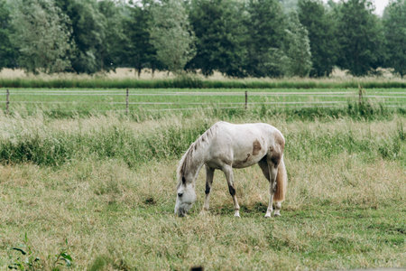 beautiful white horse grazing on grass (color toned image; shallow DOF)