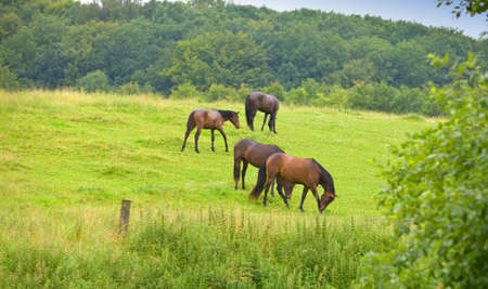 Herd of horses grazing in a green meadow in summer.