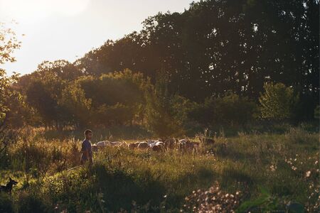 Chisinau, Moldova May 1, 2019: The boy is shallow in the field with sheep. field, trees in untouched nature at sunset. Clean pasture away from the urban lifestyle. Production concept of a healthy diet