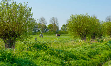 Cows in a green meadow in sunlight under a blue sky in springtime, Almere, Flevoland, The Netherlands, April 24, 2022