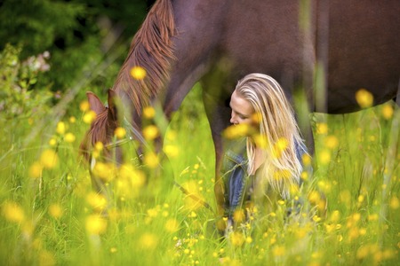 Smiling woman sits in the meadow with her arabian horse
