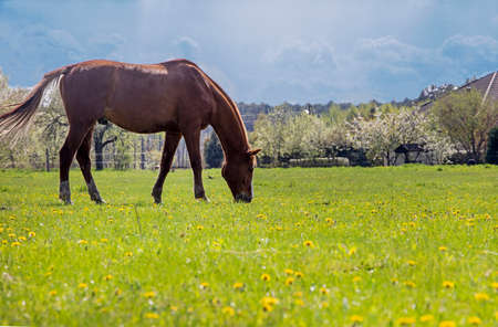 lone brown horse grazes in a field with dandelions on a sunny day