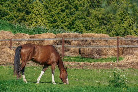 Brown horse eats grass in a meadow on the background of fence and hay