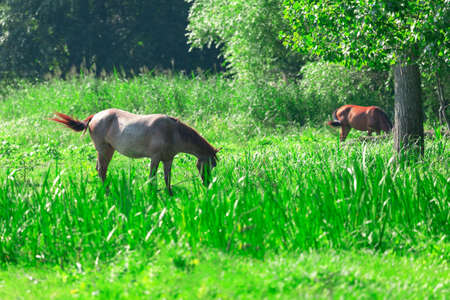 Beautiful horses grazing in the meadow. Summer meadow.