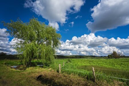 low morning sun shines over meadows with cows and willows in ooijpolder near nijmegen in the netherlands on early summer morning