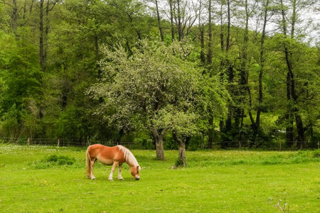 single wonderful horse near trees on a green meadow