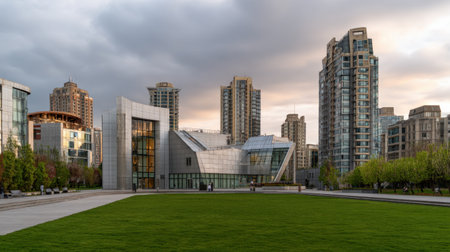 A captivating view of modern urban architecture that showcases sleek buildings and lush green spaces, set against a dramatic dusk sky in a vibrant city landscape.