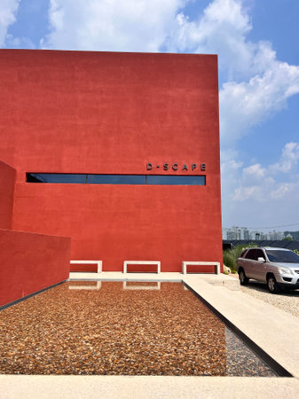 Modern red building with blue sky and white clouds in the background.