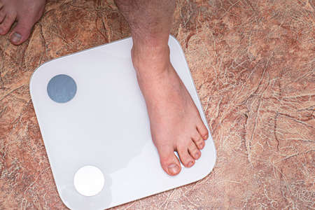 Man weighing himself - male bare feet stepping on white digital floor scales at home: close up view. Measuring weight, control, wellness and diet concept.