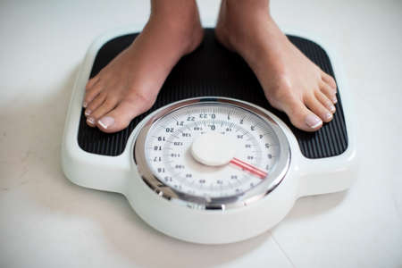 View of female feet on scale showcasing body weight