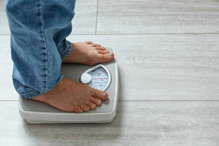 Close-up photo of woman legs stepping on floor scales indoors, space for text. Overweight problem