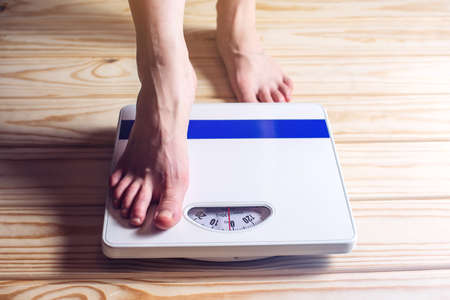 Woman foot standing on weigh scales,Selective focus