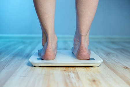 Women's bare feet stand on the floor electronic scales, to check the weight of the body and control the set of extra pounds in the blue light