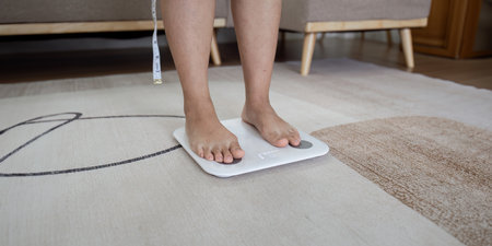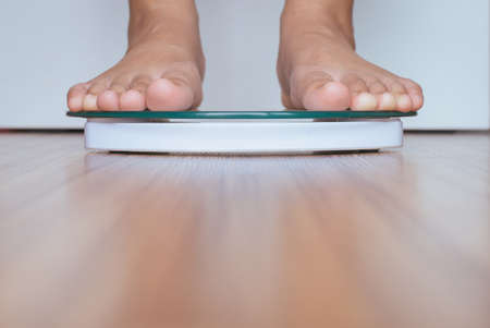 Close up of people feet standing on scale weighing.