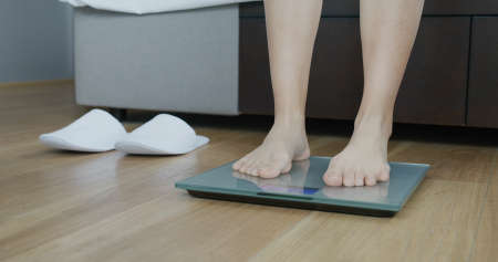 Over weight women weigh on scales to see results after exercise, healthy at home