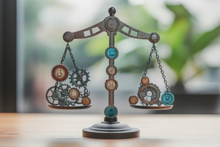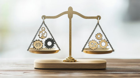 A balance scale adorned with intricate gears and symbols sits on a wooden surface, embodying the relationship between order and innovation.
