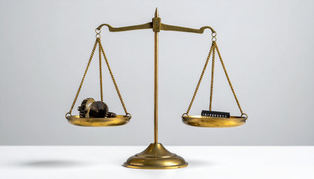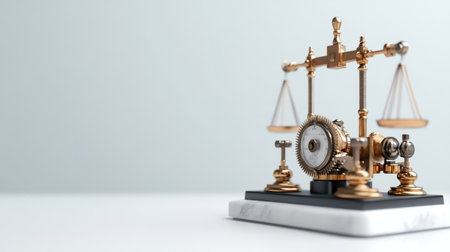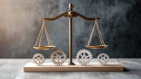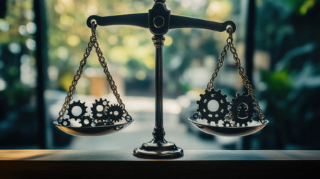 Balance scales adorned with gears sit prominently on a wooden table, symbolizing the connection between justice and mechanics.