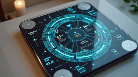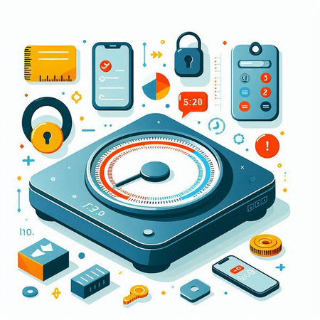 A closeup of precision weighing scales with an overlay of blockchainbased encryption icons on the display screen illustrating how weight measurements are securely logged and traced