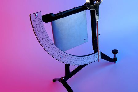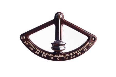 Pendulum inclinometer with wooden scale on a white background