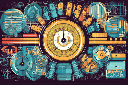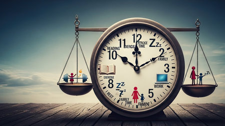 An image showcases a clock integrated into a scale, with activities like work, family, and leisure represented on the clock face. The composition uses a mix of colors and textures, set against a blurred sky background. It could be used for articles, presentations, or various other commercial applications.