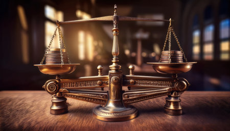 Scales of justice gracefully balance in a sunlit courtroom, adorned with rich details and textures.