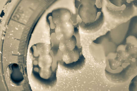 Closeup of weight scale with delicious fat and sweet bread flavor on top. Like calories that cause weight gain a lot. Health and Beauty concept. Diet and Healthcare. Overweight and Fitness