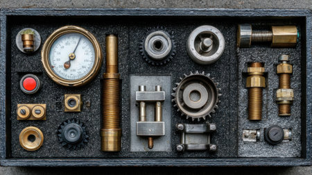 A flat display case showcases an array of mechanical components and instruments, featuring gears, gauges, and connecting fittings, highlighting craftsmanship and industrial design.