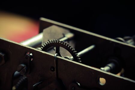 Old clockwork dirty with dust and lubricating oil. Selective focus. Shallow depth of field. Toned.