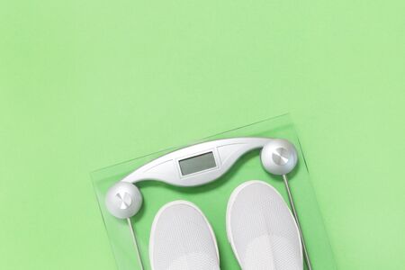 Lightweight modern textile slip on sneakers shoes with weighing scale on pastel green background. flat lay with copy space. Weight management and healthy lifestyle sport concept