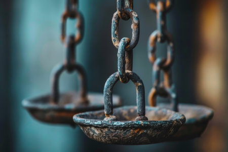A collection of scales with a small object on top of one of them. The scales are hanging from a chain and are of different sizes. The scene gives off a sense of balance and order