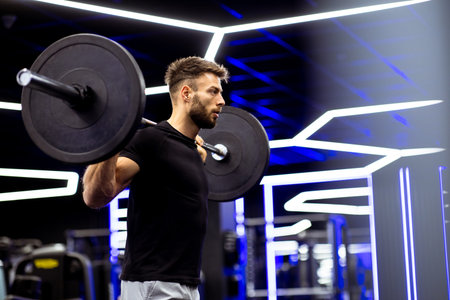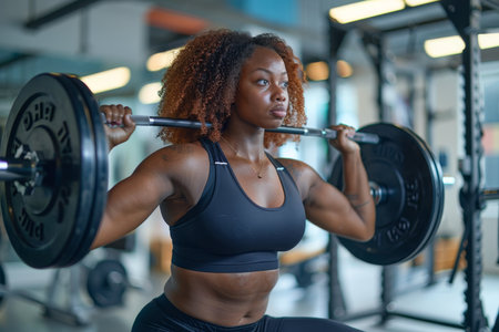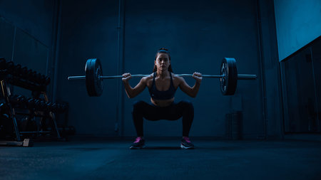 Determined athlete performing a barbell squat in a modern gym, showcasing strength and dedication to fitness and bodybuilding