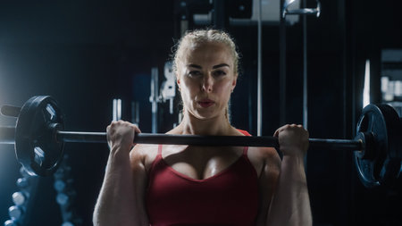 Close up shot of Muscular young woman doing weightlifting at gym Workout with the barbells Female bodybuilder doing back squats in gym Fit Woman Doing Barbell Squats In The Gym.