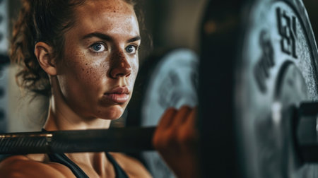 A woman holds a barbell in front of her face, showcasing strength and determination.