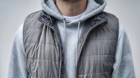 Man is wearing a gray vest and hoodie, standing in front of a gray background, perfect for your advertising