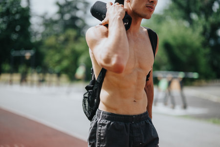 Athletic man carrying gym bag while walking in outdoor park on a sunny day