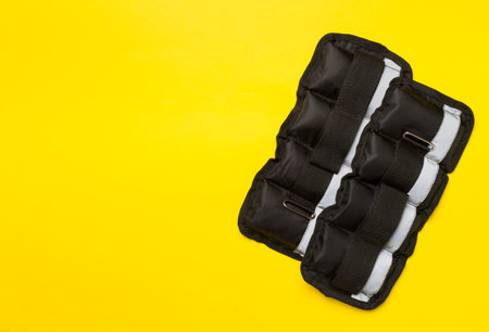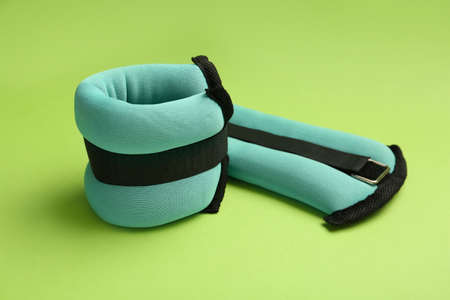 Turquoise weighting agents on beige background, flat lay. Space for text