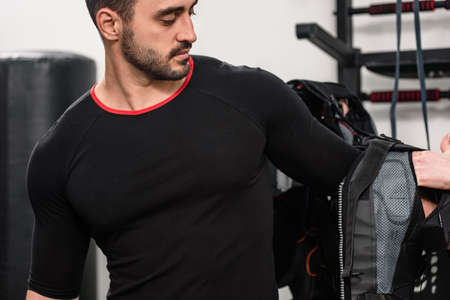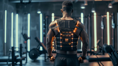 Muscular Man Wearing A Black Fitness Vest With Lighted Panels In A Gym