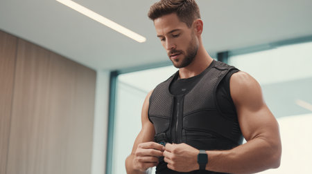 A man prepares for a HIIT workout by adjusting his smart fitness vest equipped with biometric sensors. The setting is a sleek, high-tech interior, emphasizing modern fitness technology.