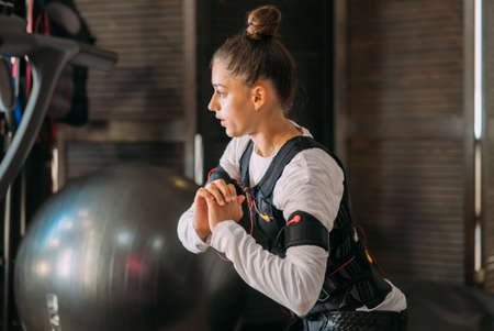 EMS training. Ecstatic girl performs exercises in a suit with cables.