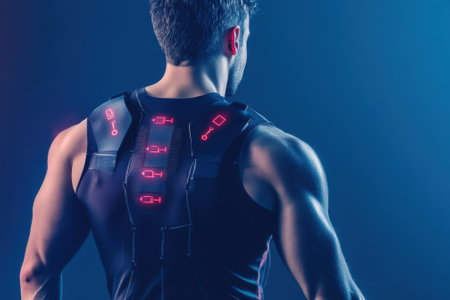 A person is engaged in a workout while wearing a high-tech vest with illuminated sensors in a gym.