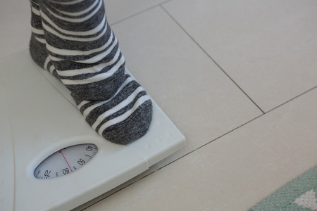 Close-up of legs in socks stepping on floor scales. Weight measure, food control, healthy care concept