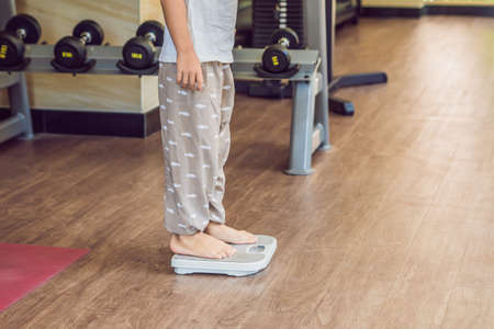 Man stand on the digital weight scale. Diet, weight loss, overweight, obesity and health concept