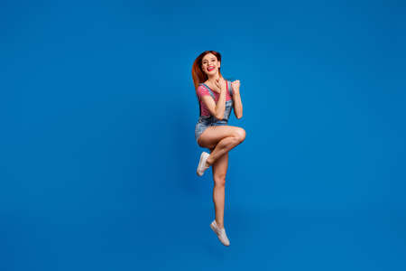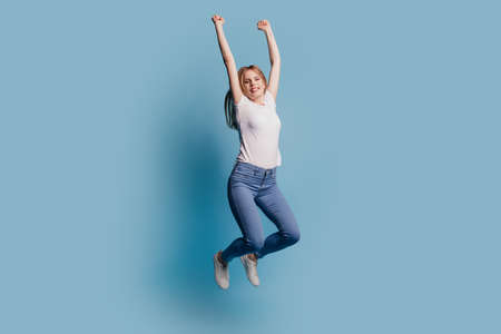 Portrait of dreamy inspired crazy lady jump enjoy weekend time raise hands on blue background