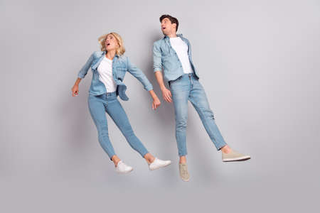 Photo of excited amazed active couple jump look empty space wear casual jeans outfit isolated grey color background