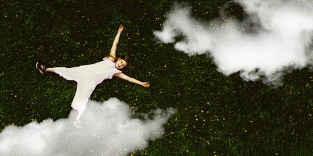 Floating in air. Relaxed girl in vintage ruffle dress levitating keeping eyes closed, sleeping while flying mid-air having comfortable peaceful dream in sky. collage composition on day cloudy blue sky