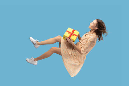 Hovering in air. Smiling happy woman in yellow dress levitating and holding her gift box, feeling joyful with her amazing birthday or christmas gift. indoor shot isolated on blue background.