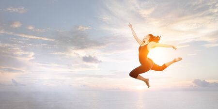 Woman gymnastic silhouette. Woman gymnast on blue sky background. Silhouetted gymnast doing the splits jump.