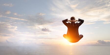 Jumping man in the sky. Man jumping in the sunshine against blue sky. Concept: freedom, success, energy, vitality.