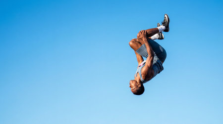 A man performing a backflip against a clear blue sky