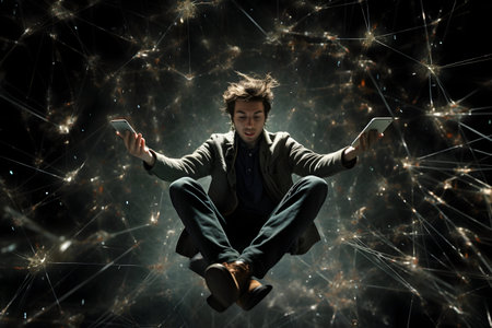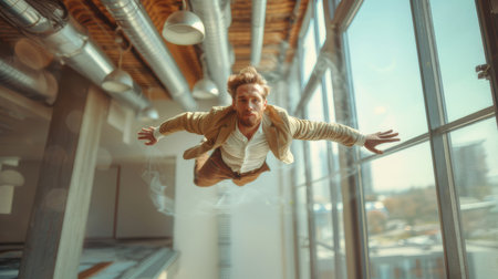 A young businessman in mid-air, flying through an office space with outstretched arms. Captures a sense of freedom, ambition, and innovation in a professional setting.
